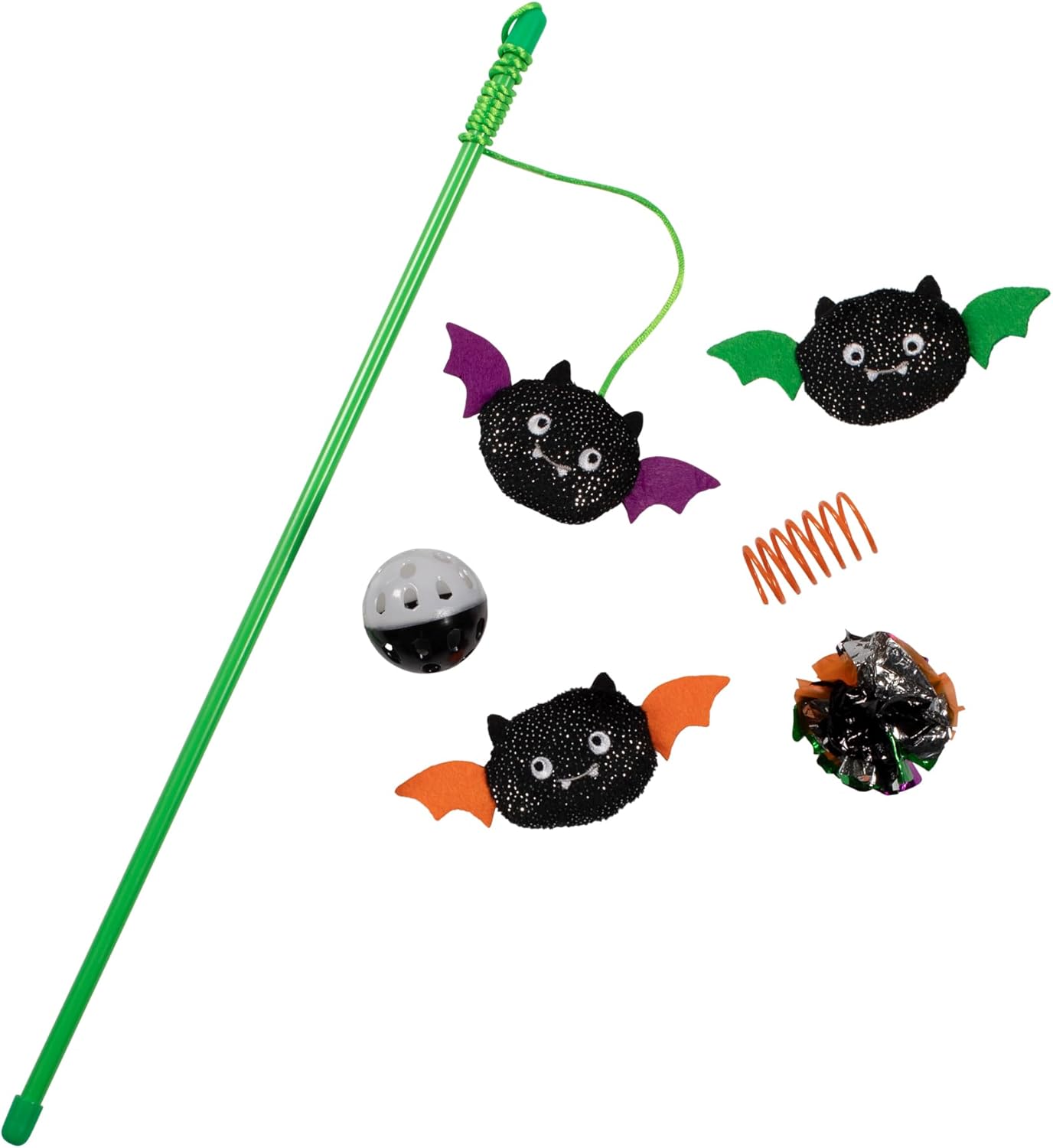 - Each toy is approximately: Wand: 17" h Rope: 22." h Purple Bat: 2" h x 4.75" w Green Bat: 2" h x 4.75" w Orange Bat: 2" h x 4.75" w Plastic Ball: 2" h x 2" w Plastic Spring: 1" h x 1" w Crinkle Ball: 2" h x 2" w